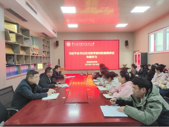 为贯彻落实《黄河水利职业技术大学2025年下半年政治理论学习及思想道德教育计划》学习要求,11月18日,国际教育学院传达学习习近平总书记在河南考察时的重要讲话和习近平总书记关于河南工作的重要论述,引导全院教师深刻领会习近平总书记重要讲话精神的核心要义和实践要求,自觉将讲话精神融入日常教学和理论研究工作中,引导广大青年学生坚定理想信念,投身强国建设。