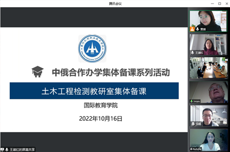 2022年10月16日下午,中俄合作办学土木工程检测专业教学研讨会在线进行。南乌拉尔大学建筑学院教授Сергей Николаевич、Наталья Владимировна、土木工程检测教研室主任王淑红、专业课教师和俄语教师参加会议。