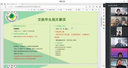 2022年11月9日上午,2023年大邱大学交换生项目研讨会在线召开,河南省外服中心部长杨志勇,对外联络与合作处负责人,国际教育学院领导班子,韩语教师以及辅导员参加了会议。