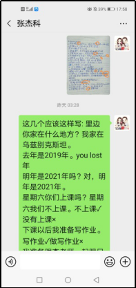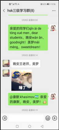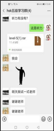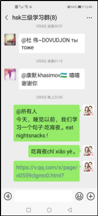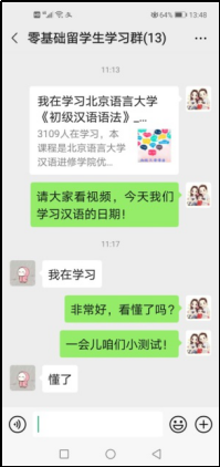 此外,为了做好境外学生的学业监督,丰富留学生的课后生活,教学之外老师们还在中国大学慕课、网络孔子学院、汉语考试服务网等网站搜集各类优质教学资源,转发至班级微信群,推出“每日汉语”系列小微课,包含“每日汉语语法”、“汉语900句(每日一句)”、“每日hsk辅导”三类微课,通过线上教学+课下学习的模式,使学生每天有所收获。