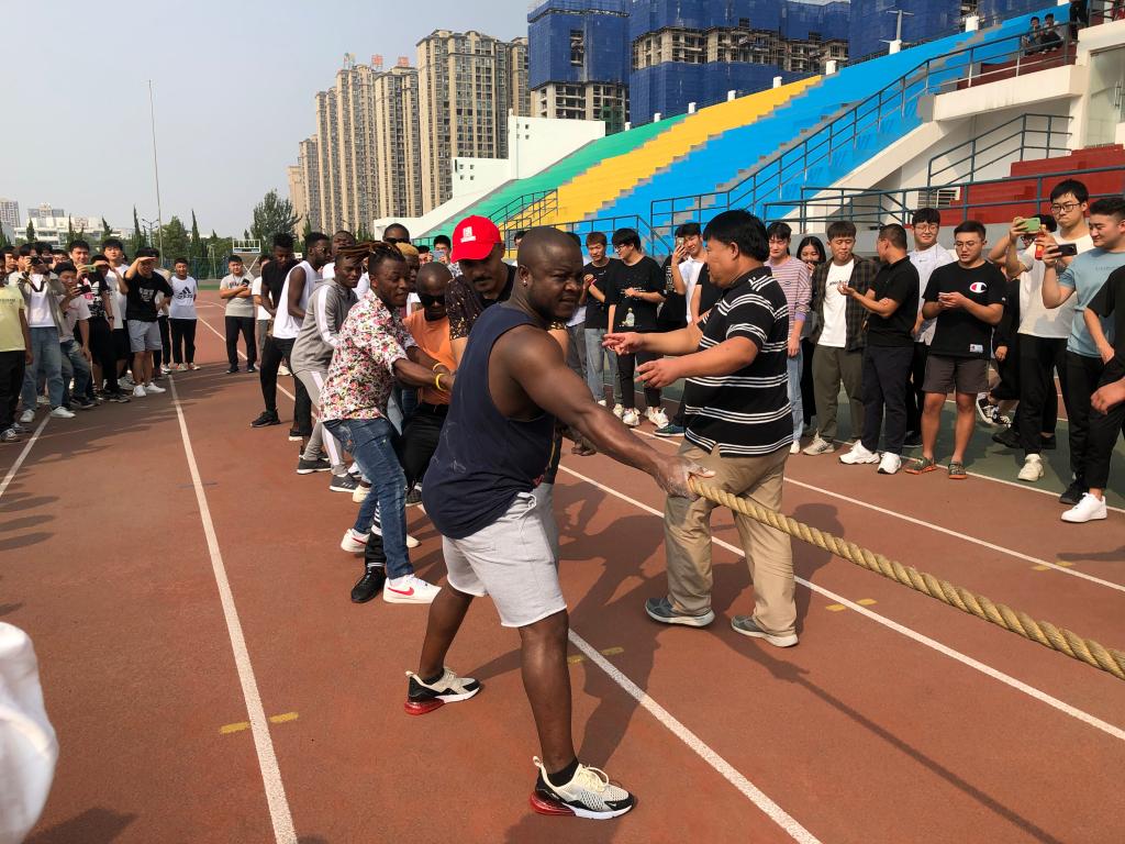 10月1日下午,国际教育学院组织留学生和中外合作办学班级的学生在学校东南操场上举办拔河比赛。