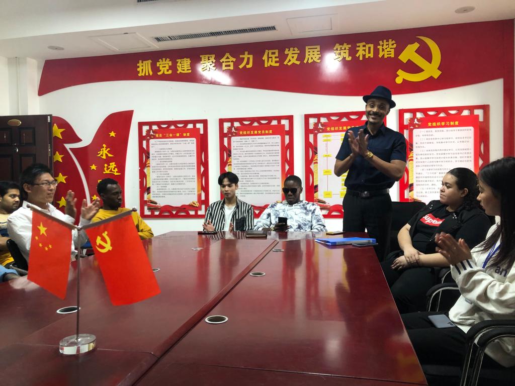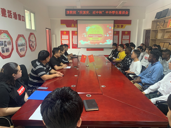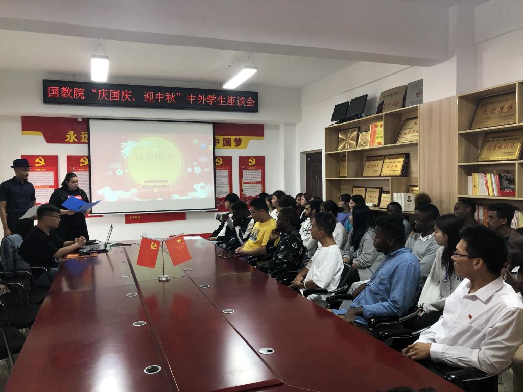 10月1日上午,国教院在SY5503组织召开“庆国庆、迎中秋”中外学生座谈会,学院领导、留学生班主任、中外学生代表参加了座谈。党总支书记楚万强向同学们介绍了中秋节的由来和习俗,并赋诗一首以表对祖国的祝福和对学生的问候。座谈会上,中外学生畅所欲言,表达了对中国的热爱之情,留学生们还介绍了各自家乡的传统节日和风俗。留学生温尼、布凯为大家朗诵《水调歌头》,表达了对中国传统文化的喜爱,电影《我和我的祖国》片段,让同学们了解新中国成立的艰辛和不易,更加珍惜现在的幸福生活,丰富的趣味游戏如成语接龙、用汉字造句、铁圈竞赛等,使留学生进一步体会了汉语的魅力。座谈会最后,学院领导为中外学生分发了月饼和水果,座谈会在一片欢声笑语中度过。