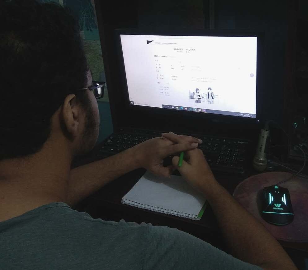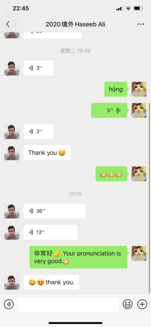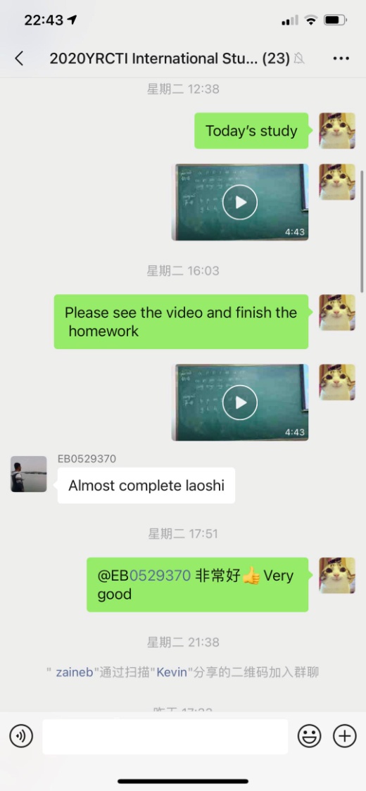 目前共有18名来自4个不同国家的境外留学生开始进行线上授课。针对境外留学生国籍不同,时差不同的特点,留学生教学团队主要采取异步网课进行线上授课,上课通过录课形式进行,将课程生词、语法、重难点、情景练习等课程内容录制下来,发送到境外留学生微信群中。留学生通过观看视频和学习资料,完成老师布置的作业任务,老师再一对一进行检查,通过语音或者书面的形式将问题反馈给学生。