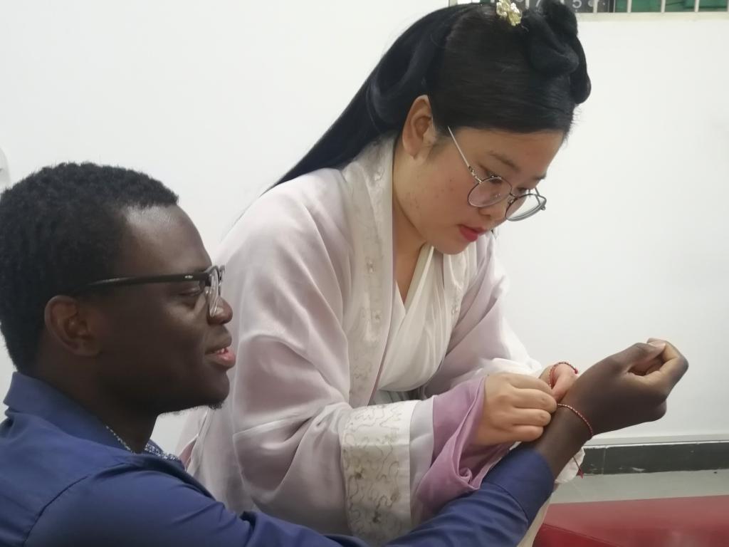 首先,丁老师向各位留学生讲解端午节的由来,以及端午节的相关习俗。接下来三位老师身穿汉服带领留学生一起体验点雄黄、系五彩绳等传统习俗,为同学们讲解其驱除害虫、祈福纳吉的含义。之后留学生们进行了欢乐的“抢椅子”与“击鼓传花”游戏,留学生们展示了丰富的才艺。最后在欢声笑语中,大家一起品尝了美味的粽子。