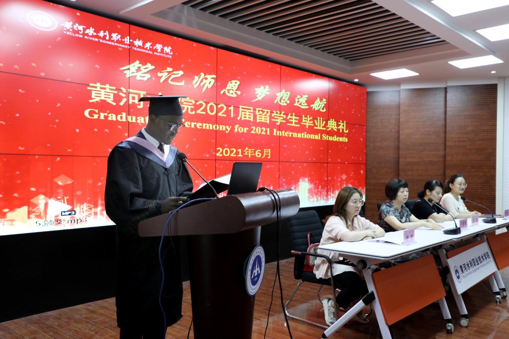 刚果金留学生古天乐作为优秀毕业生代表发言。他用流利的汉语分享了自己三年来的学习和生活感受,尤其是疫情期间学校及老师对留学生无私的关心和照顾,表达了对中国政府、学校和老师们的感激之情。