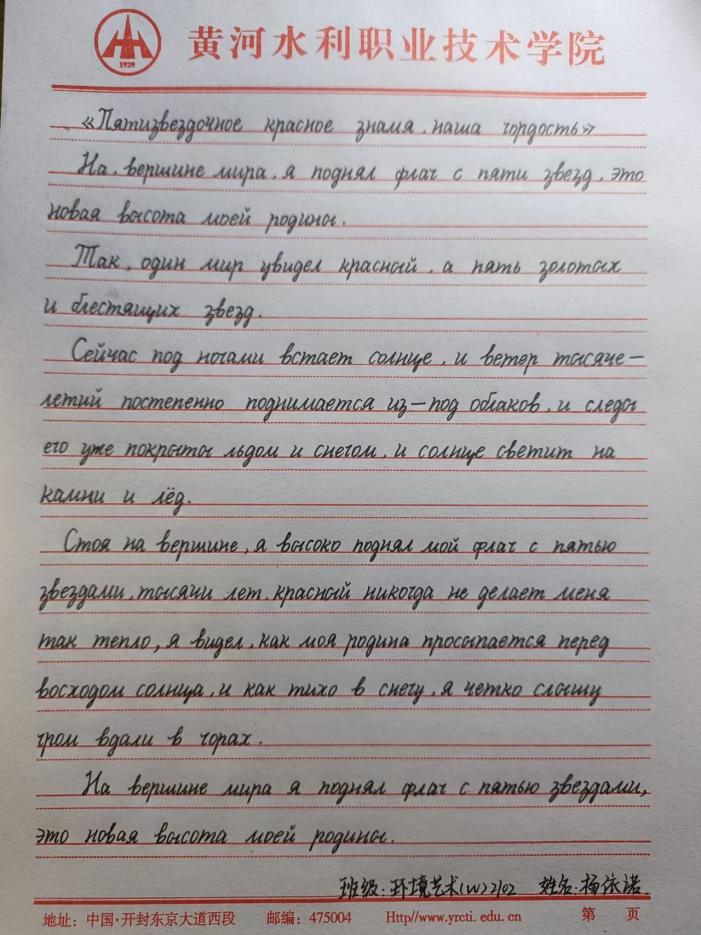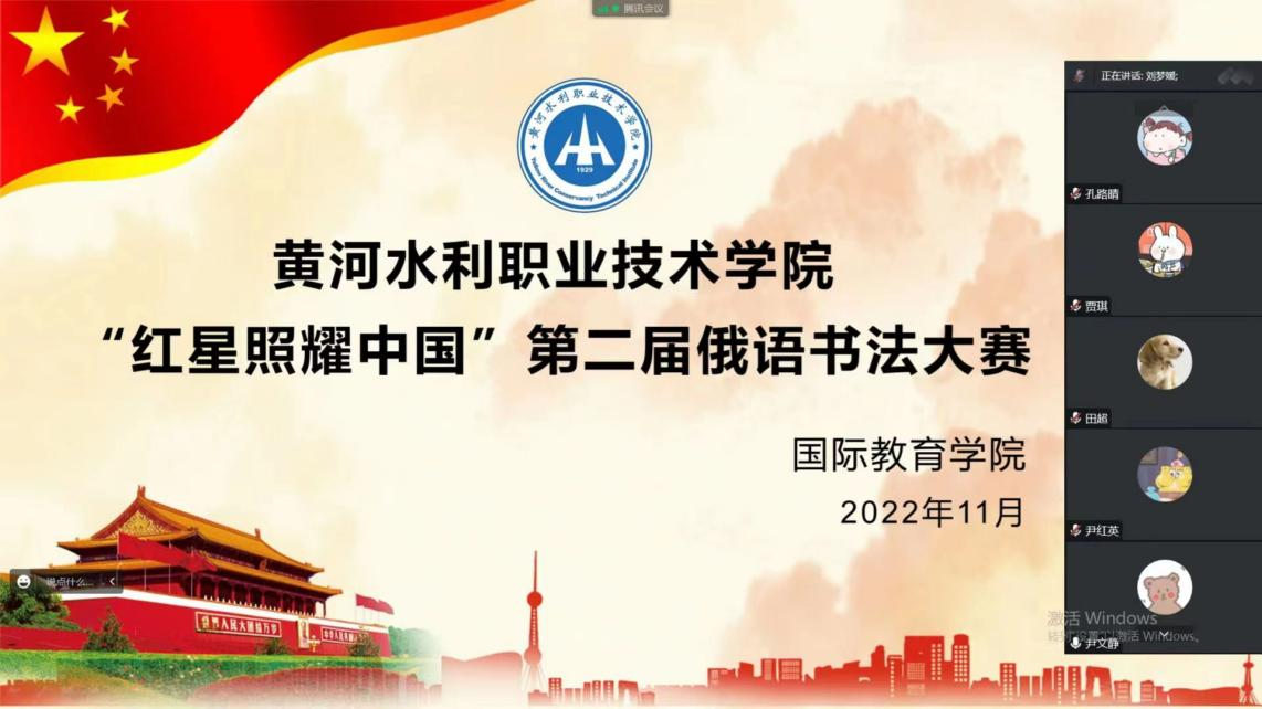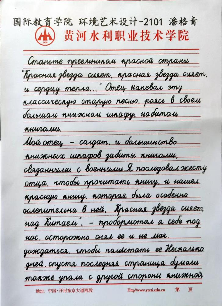 2022年11月22日,国际教育学院开展了“红星照耀中国”为主题的黄河水院第二届俄语书法大赛比赛通过线上提交作品, 2021、2022级全体中俄班学生参加此次比赛。经过俄语教学团队认真谨慎地评比,优秀作品脱颖而出,其中获奖作品一等奖5名,二等奖5名,三等奖6名。