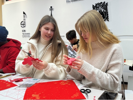 下午两点,国教院在中外学生文化交流中心JX7122教室举办“体验书法、剪纸,感受传统文化”活动。活动现场,中国学生与留学生共同挥毫泼墨,书写与冬至相关的诗词歌赋,展现了中国传统文化的博大精深。剪纸区亦是热闹非凡,师生们巧手剪裁,将一张张彩纸化作栩栩如生的雪花、梅花等生动形象,寓意着冬至的吉祥与美好,彰显了中华民族传统节日的深厚底蕴和文化魅力。