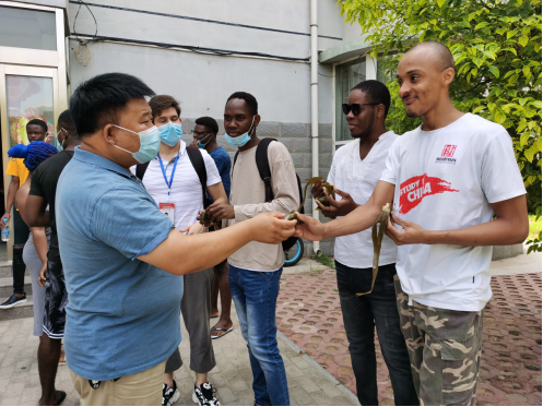 国际教育学院党总支书记楚万强首先向留学生们介绍了端午节的由来和习俗,随后老师们为留学生分发学院为他们准备的端午礼物——蜜枣粽子,吃到甜甜的粽子后,留学生们纷纷竖起大拇指,说道:“粽子真甜,软软的特别好吃!”幸福甜美的笑容洋溢在每位同学的脸上。最后,副书记王成伟教给留学生们一首歌谣:“桃儿红,杏儿黄。粽子香,包五粮。剥个粽子裹上糖,幸福生活万年长。”文化体验活动在歌谣中结束。