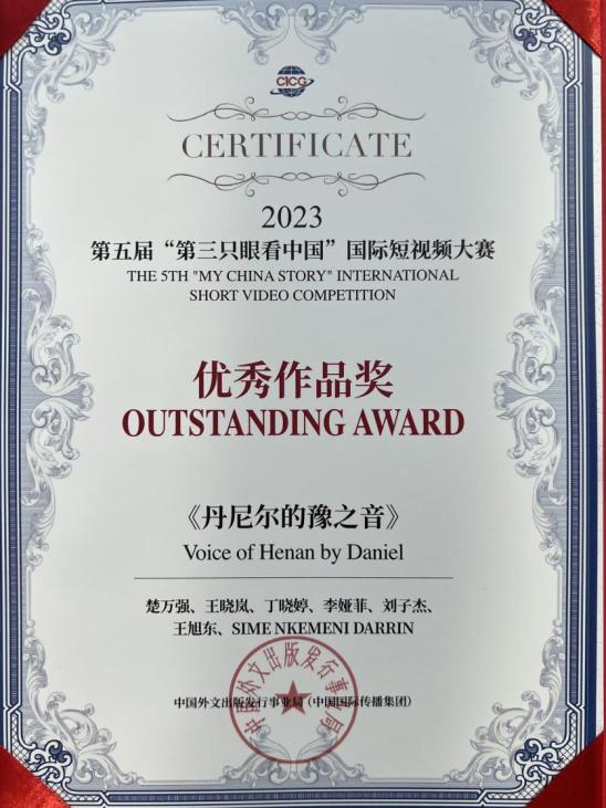 1025日,由中国外文局、河南省人民政府新闻办公室主办,郑州市人民政府新闻办公室、中国外文局煦方国际传媒承办的2023年第五届“第三只眼看中国”国际短视频大赛颁奖典礼在河南郑州举行。我校参赛作品《丹尼尔的豫之音》获优秀作品奖。国际教育学院党总支书记楚万强出席颁奖典礼并代表主创团队领奖。