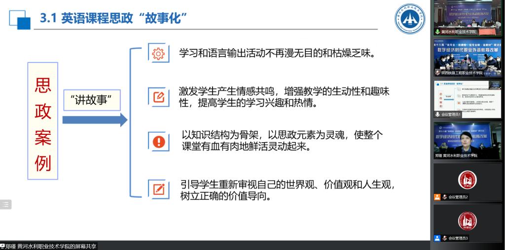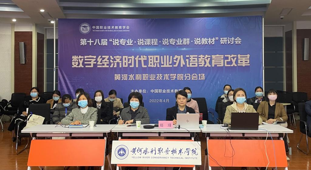 415-16第十八届“说专业·说课程·说专业群·说教材”研讨会在北京、西安两地连线召开。中国职业技术教育学会会长、教育部原副部长鲁昕教育部职业教育与成人教育司副司长谢俐,陕西省教育厅副厅长高岭出席会议并讲话,北京外国语大学外研集团党委书记、董事长,外语教学与研究出版社社长王芳主持会议。会议采取线上线下相结合的方式召开,黄河水利职业技术学院在四号楼演播厅设分会场,国际教育学院院长王爱琴、副院长郑瑾及部分教师代表参加会议,郑瑾代表我校做经验分享。