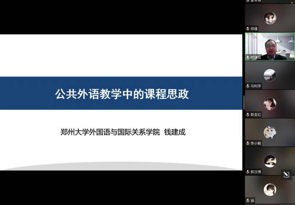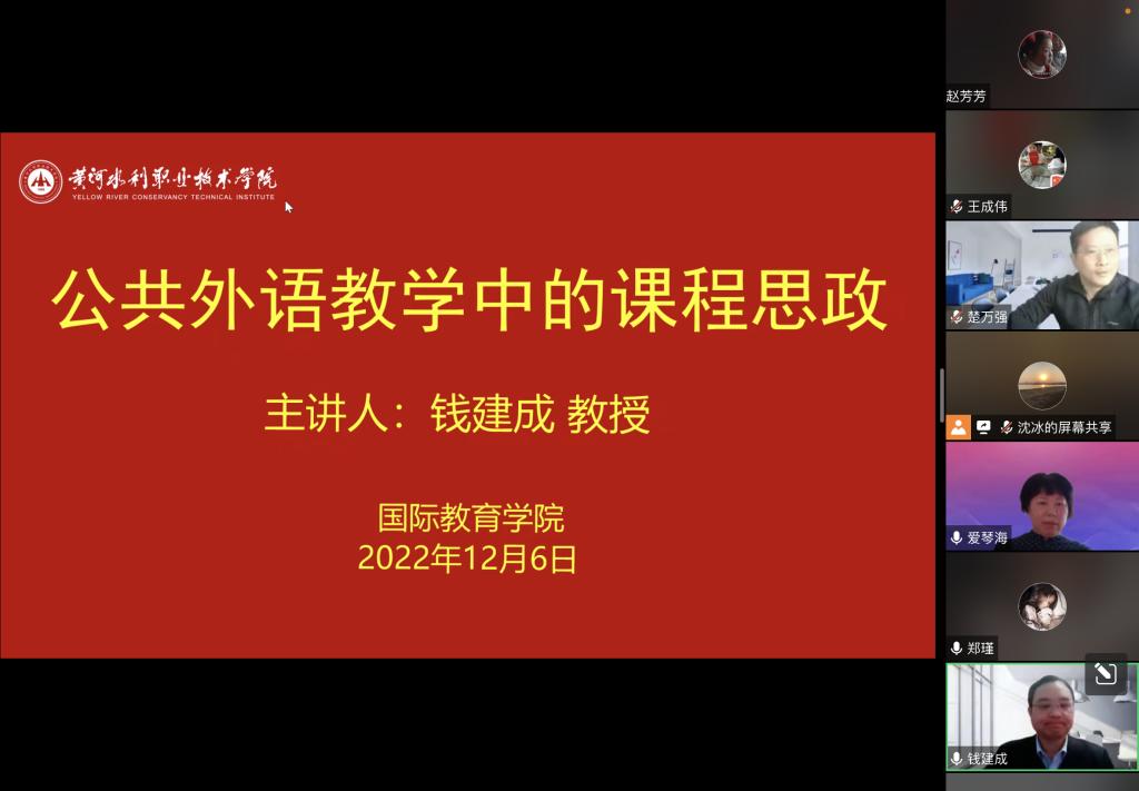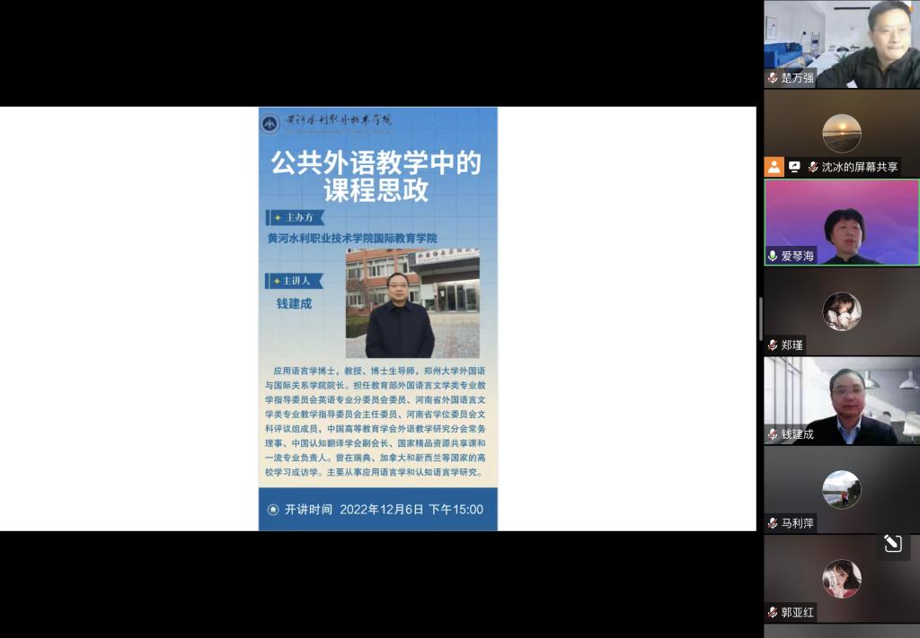 2022年12月6日下午,国际教育学院邀请郑州大学外国语与国际关系学院院长钱建成教授作题为《公共外语教学中的课程思政》的专题讲座,讲座在线举行,学院领导班子和全体教师参加,讲座由院长王爱琴主持。