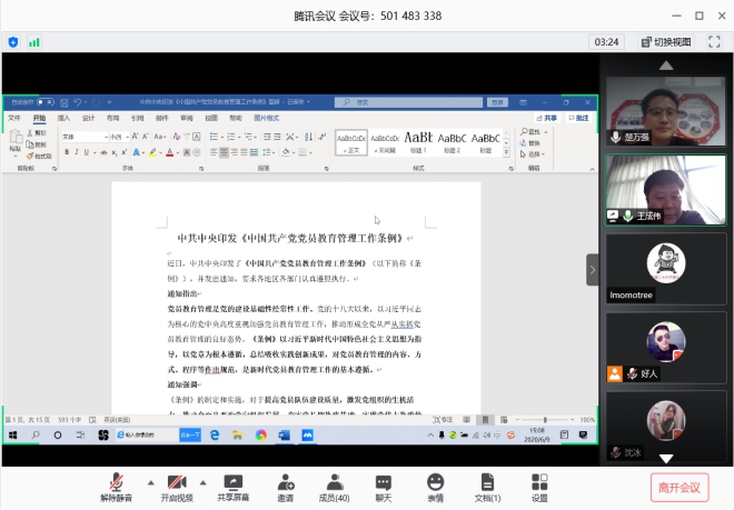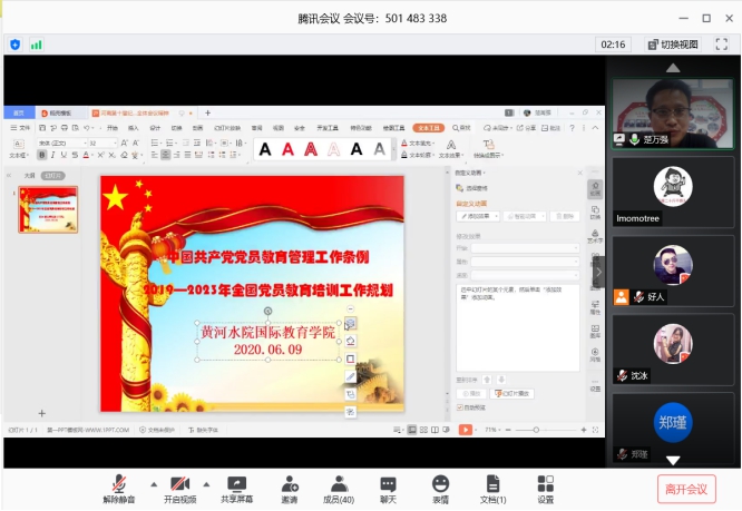 6月9日下午,国际教育学院在线上召开政治理论学习会,学习《中国共产党党员教育管理工作条例》(以下简称《条例》)和《2019—2023年全国党员教育培训工作规划》(以下简称《规划》)精神。学院全体教职工参加,会议由学院党总支书记楚万强主持。