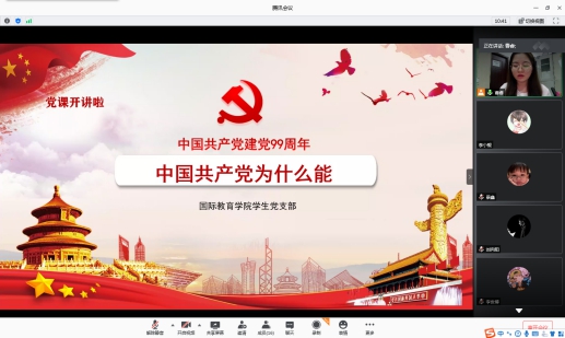 为庆祝中国共产党成立99周年,国际教育学院学生党支部2020年7月17日下午在线上开展了“中国共产党为什么能”专题党课活动。党课由党支部书记曹睿主讲,党支部全体成员参加。