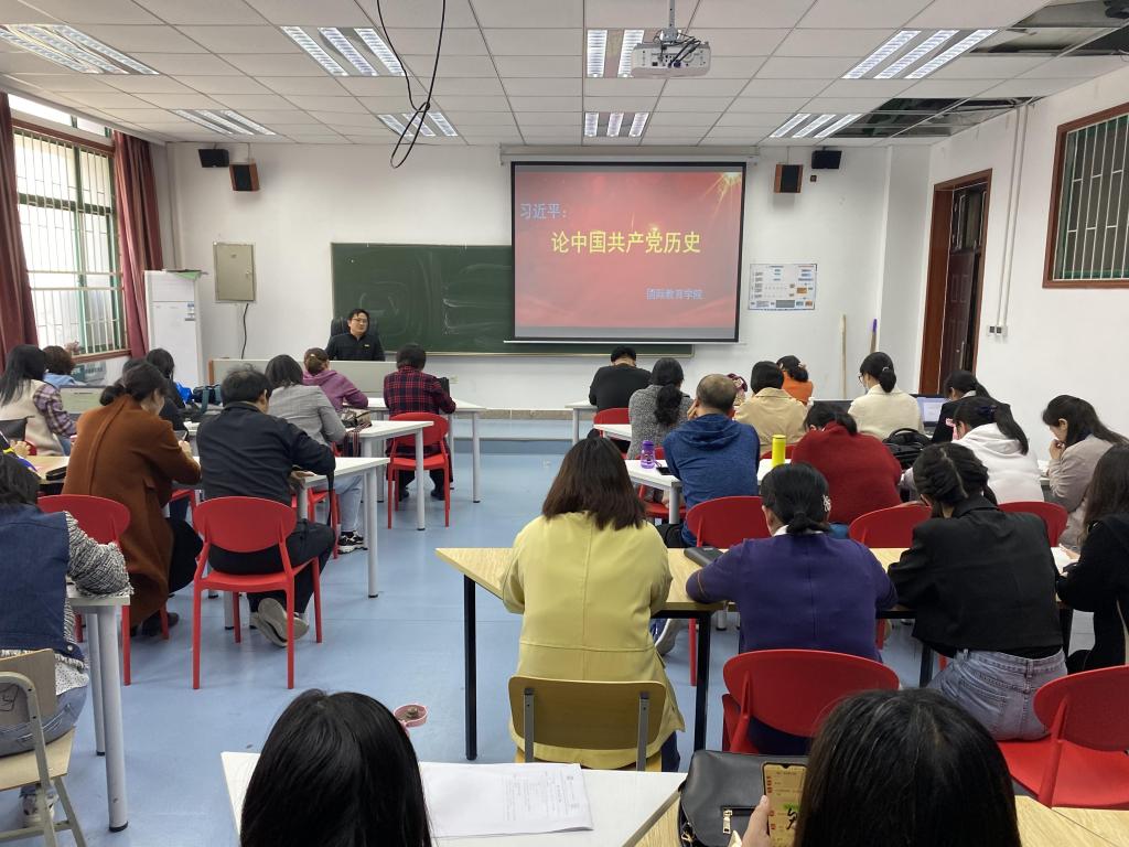 在会议上,楚万强领学了习近平同志《论中国共产党历史》的文章内容。全体教师认真聆听并做笔记。
