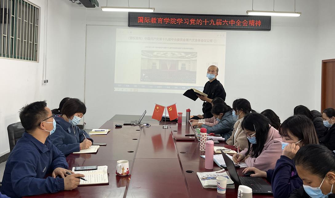 11月16日下午,国际教育学院召开理论学习会议,学习党的十九届六中全会精神,传达校党委对学习宣传贯彻党的十九届六中全会精神的部署。党总支书记楚万强主持会议,全院教职工参加会议。