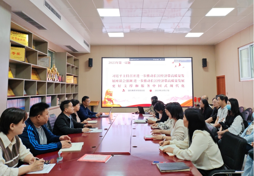 20231017日,国际教育学院党总支在JX7408会议室开展专题理论学习活动,学习习近平总书记在进一步推动长江经济带高质量发展座谈会上的重要讲话精神。学院全体党员参加学习活动。