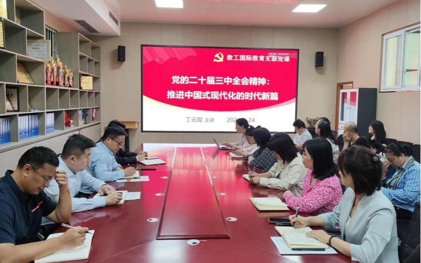 2024年9月24日下午,教工国际教育支部在JX7408会议室开展党课学习活动。党支部副书记丁云霞以《党的二十届三中全会精神:推进中国式现代化的时代新篇》为题,为支部全体党员上党课。