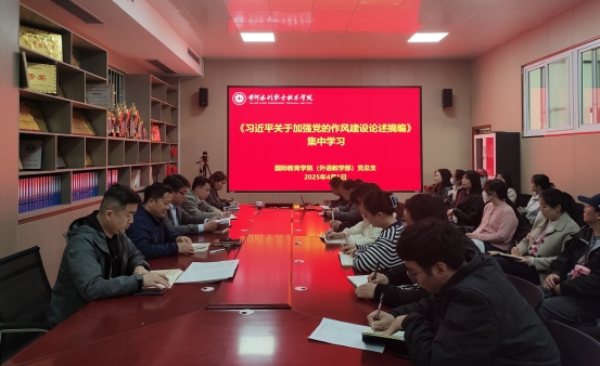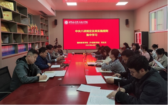 41日,根据学校《关于举办深入贯彻中央八项规定精神学习教育读书班暨干部培训的通知》要求,国际教育学院组织召开《习近平关于加强党的作风建设论述摘编》和中央八项规定精神及其实施细则专题学习会。全体党员及教职工参加此次会议,会议由党总支副书记赵巍主持。