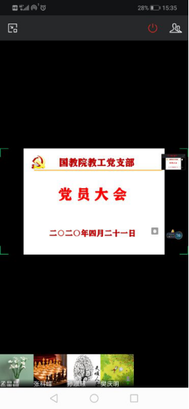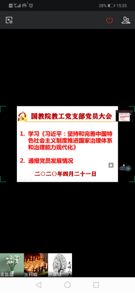 2020年4月21日下午,国教院教工党支部通过“企业微信会议”组织召开了“线上”支部大会,党支部书记主持了会议,支部全体党员参加。