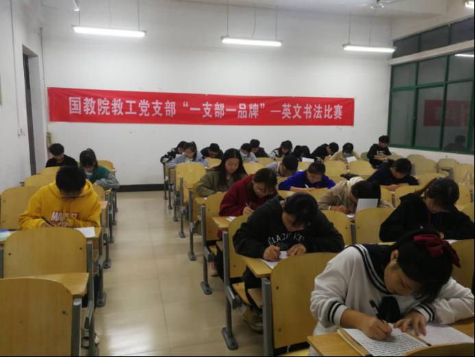 根据2020年度一支部一品牌建设方案202010月22日、23日晚上,国际教育学院教工党支部联合校英语社团—英语部落在JX5314举办了英语书法比赛。来自全校各年级、专业的近200名学生参加了此次比赛。