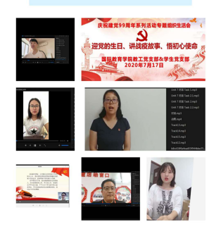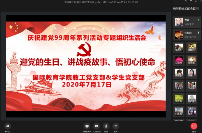 2020年7月17日下午,国际教育学院党总支在线上召开了“迎党的生日、讲战疫故事、悟初心使命”主题组织生活会。学院全体教工支部党员和学生支部党员参加。会议由教工党支部书记张科峰主持。