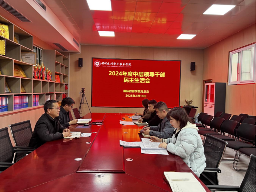 2025年2月18日上午,国际教育学院在7号教学楼7408会议室召开了2024年度中层领导干部民主生活会。学院领导班子全体成员参加了此次会议,学生支部副书记及兼职纪检监察员列席会议。本次会议由学院党总支书记楚万强主持。