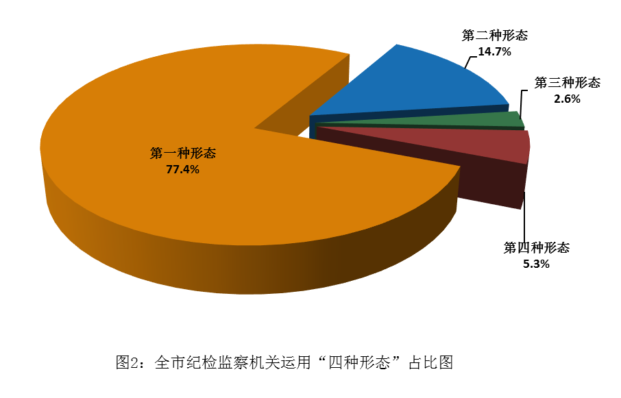 2021年第一季度,全市纪检监察机关运用监督执纪“四种形态”批评教育帮助和处理1385人次。其中,运用第一种形态1073人次,占总人次的77.4%;运用第二种形态203人次,占14.7%;运用第三种形态36人次,占2.6%;运用第四种形态73人次,占5.3%。