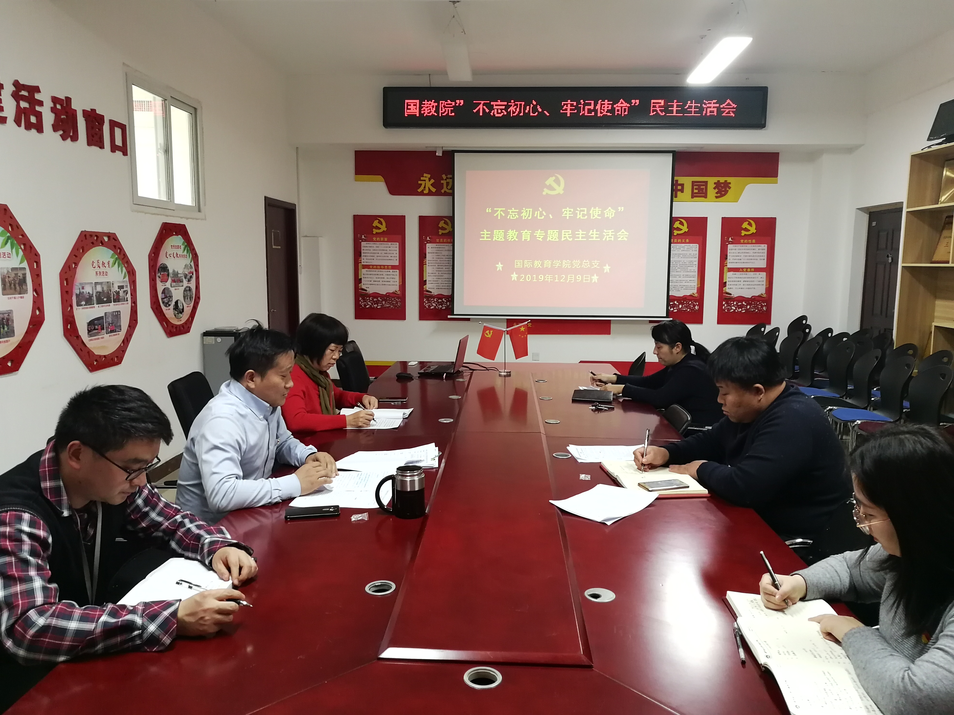 12月9日下午,国际教育学院在SY5503会议室召开“不忘初心、牢记使命”主题教育专题民主生活会。院党总支书记楚万强、院长王爱琴、副书记王成伟、副院长郑瑾参加,纪检委员顾哲、党总支办公室主任曹睿列席会议。会议由院党总支书记楚万强主持。