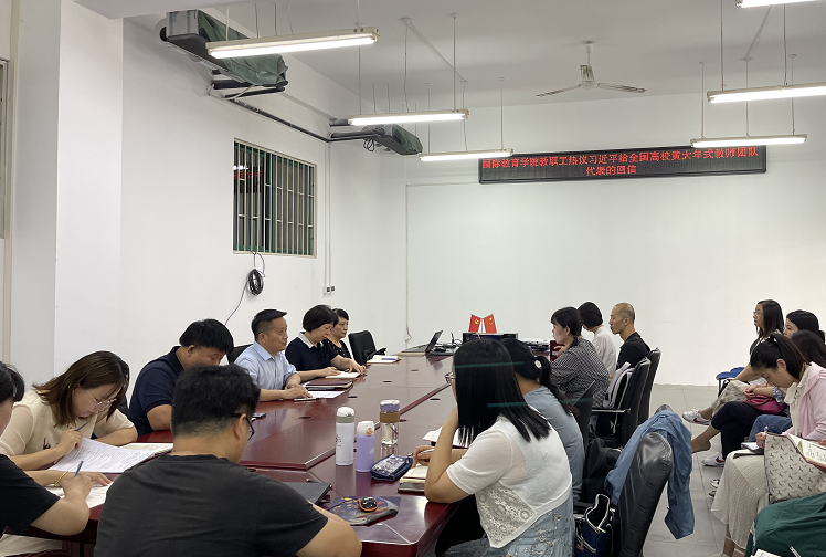 9月14日下午,国际教育学院在JX7408会议室召开政治理论学习会,学习习近平总书记给全国高校黄大年式教师团队代表的回信精神。学院全体教职工参加,会议由院党总支书记楚万强主持。