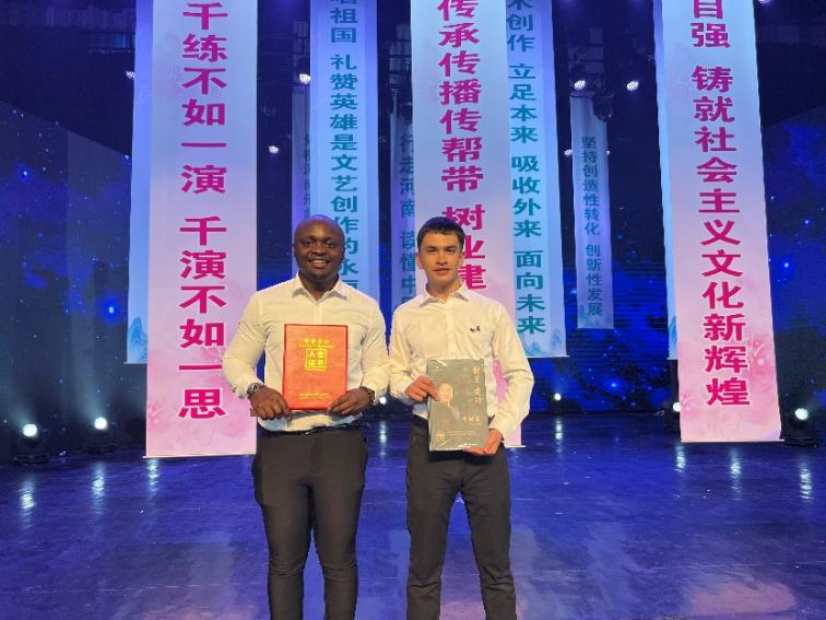 学习贯彻习近平新时代中国特色社会主义思想主题教育开展以来,国际教育学院紧扣“学思想、强党性、重实践、建新功”总要求,坚持学思用贯通,理论学习促学院高质量发展。5月17日上午,由河南李树建戏曲艺术中心主办的“树业建功李派弟子展演周”活动在郑州河南豫剧院二团儿童剧院举行。我校2名留学生丹尼尔(赤道几内亚籍)和马悠(乌兹别克斯坦籍)受邀出席活动并现场拜师豫剧大家李树建,成为李派豫剧外籍弟子。
