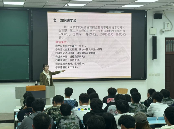 2023年9月,新生入学伊始,进行资助政策的全面宣讲,包括在校学习期间国家及学校出台的资助政策、讲解国家设立资助项目的申请及具体办理等相关流程、建档立卡学生资助政策、国家助学贷款相关政策等。确保每一位学生都了解国家及学校奖、助、贷等各项资助政策;确保每一位家庭经济困难学生都得到相应的帮扶。