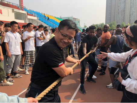 院党总支书记楚万强与留学生一起拔河