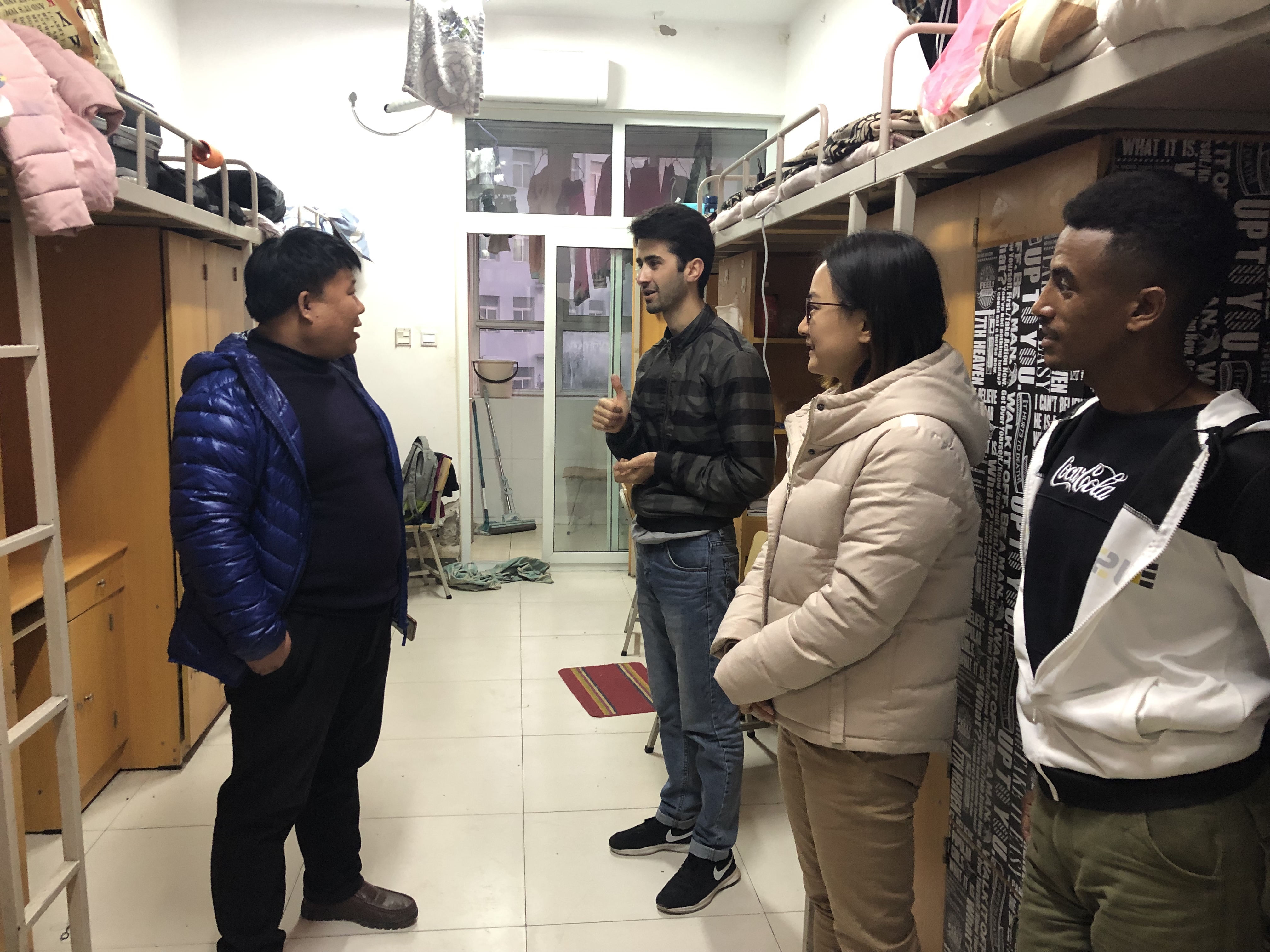 2019年12月 11日下午,国际教育学院党总支副书记王成伟带领2018级,2019级留学生班主任沈冰,赵晋萱深入1号宿舍楼留学生公寓,深入了解留学生在校的学习、生活情况。