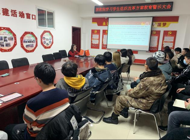 2020年12月3日国际教育学院在实训楼5503会议室召开了学习学生组织改革方案教育警示大会,全体学生会干部参加会议由院分团委书记曹睿主持。