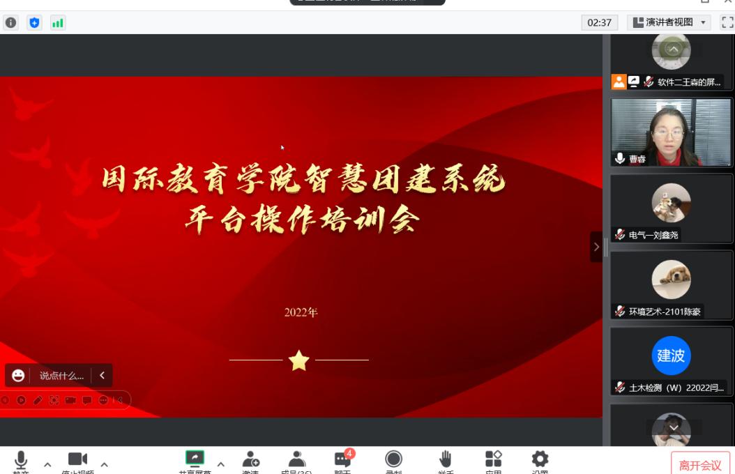 2022年12月11日,国际教育学院在腾讯会议平台召开了团干部培训会,学院分团委书记曹睿出席,各团支部书记参会。