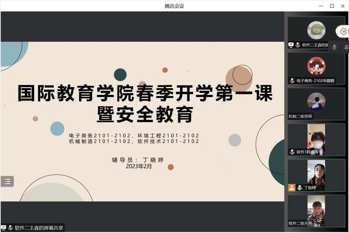 新学期伊始,为营造良好学习氛围,激发学生学习热情,对同学们做好思想教育,收心正风为开学做好准备工作。2023年2月14日,国际教育学院2021级辅导员丁晓婷老师组织中韩合作办学与机械设计与制造共四个专业召开线上开学第一课主题班会。