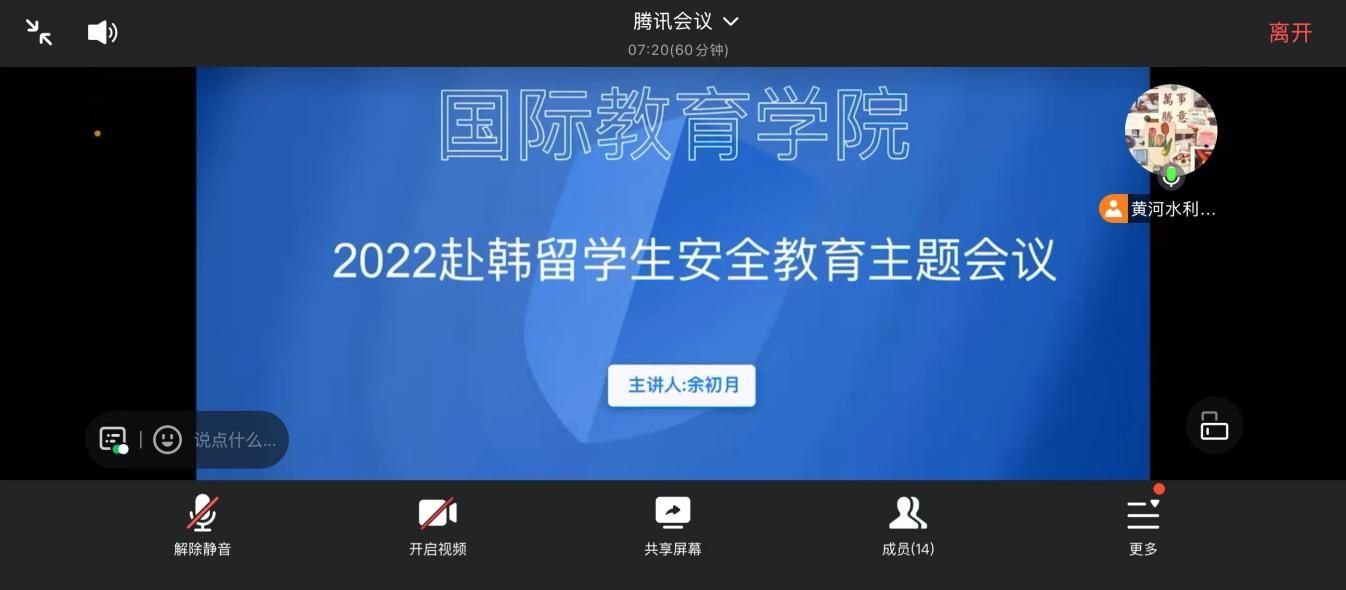 随着我校国际化办学水平的提升,国际教育学院2022级中韩合作办学13名同学赴韩国大邱大学学习深造,以拓宽国际视野、提升专业素养。为及时掌握赴韩留学生在韩国的学习和生活动态,提高同学们的自我保护意识,国际教育学院定期进行安全教育,2024年11月1日,我院组织召开线上赴韩留学生安全教育例会本次会议由辅导员余初月主持