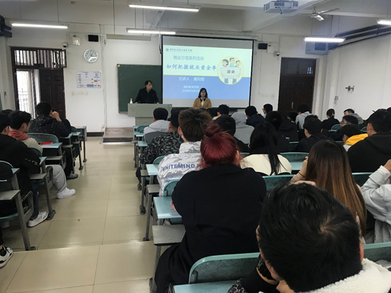1028日中午,国际教育学院就业沙龙系列活动——“如何把握就业黄金季”专题讲座在JX4303举行。学院邀请招生就业服务中心指导咨询科科长龚向哲老师为2021届毕业生作就业指导专题讲座,校企合作主任沈冰、毕业班辅导员黄海燕及全体在校毕业生参加此次活动。