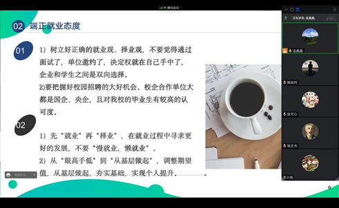 孟晶晶老师从三个方面和同学们进行了交流:一是认清就业形势,明确自己未来的就业选择;二是端正就业态度,理性评价自我;三是正确认识就业路径,树立“先就业,后择业,敢创业”意识。鼓励同学们在以后的就业工作中树立积极的人生观和价值观,把握时机,在后续的学习和工作中展现自己的才华。