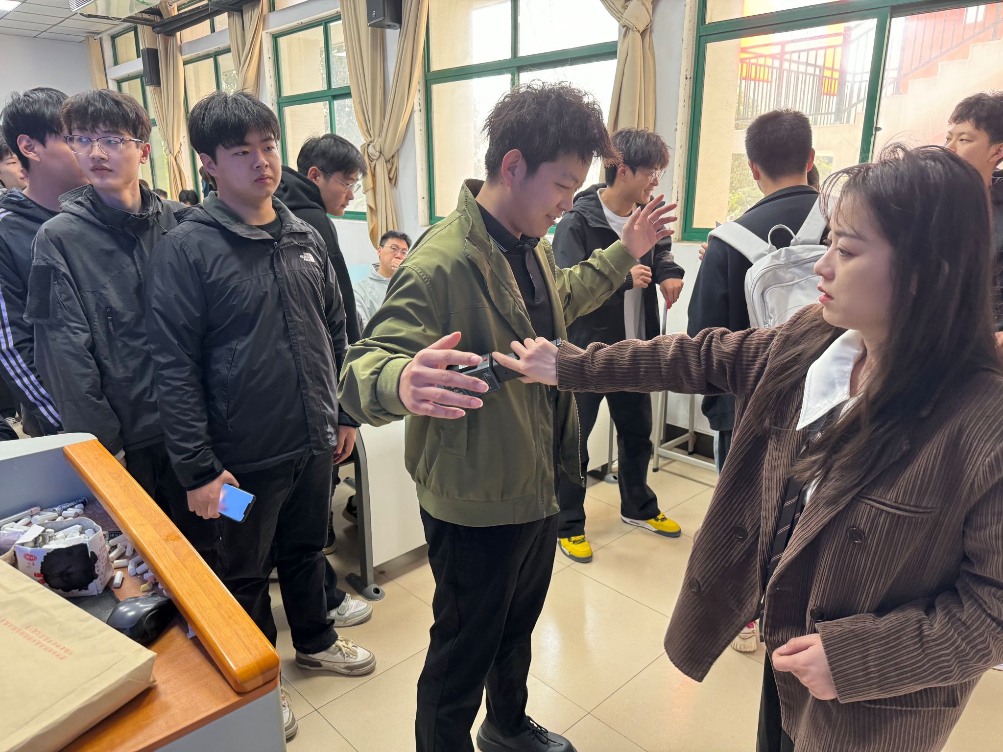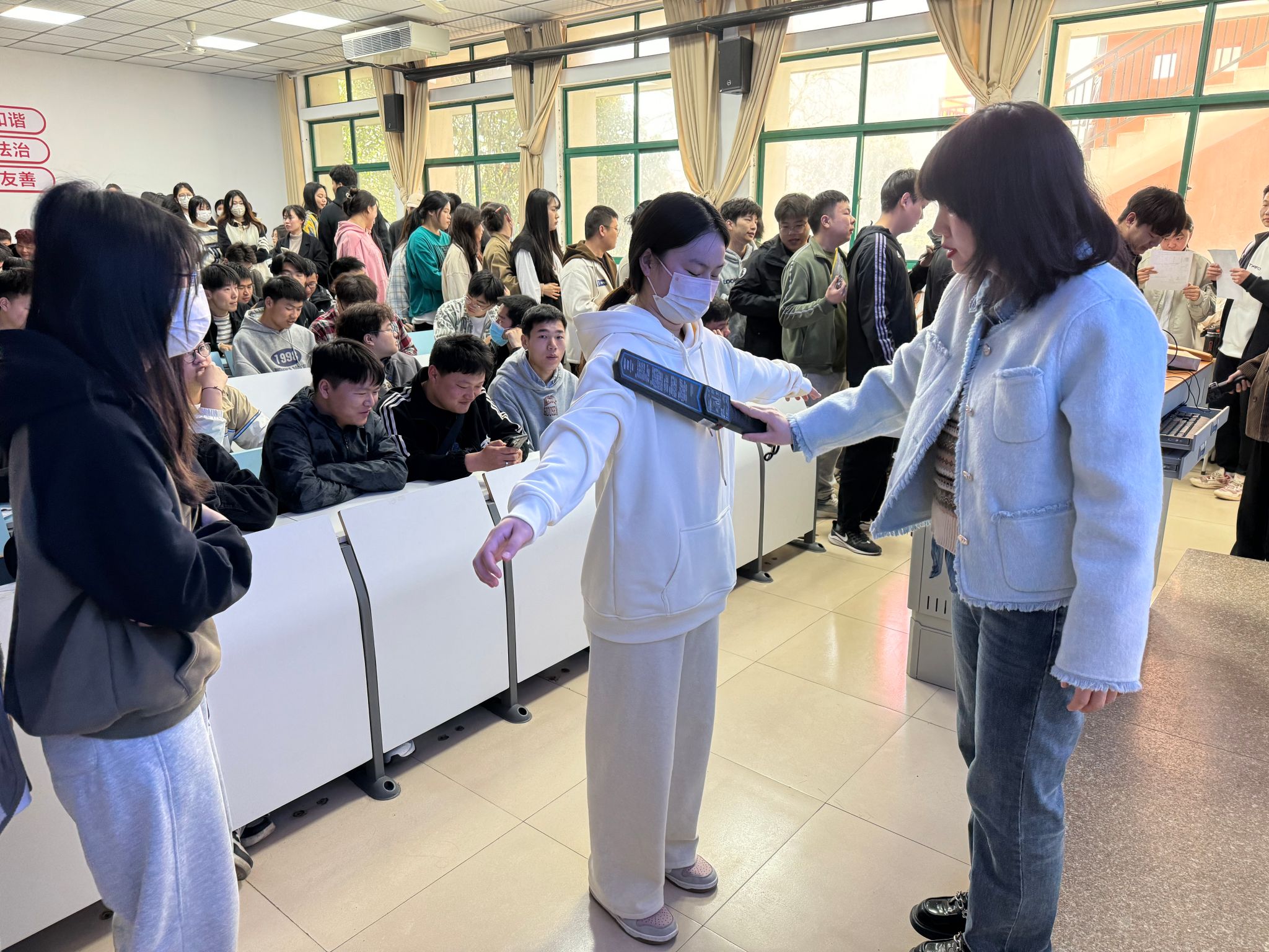 会后依照“无声入场”金属探测检查操作办法,辅导员老师组织学生进行模拟演练,整个演练严格按照流程规范操作,检查时按照从身体正面至背面,从上到下的顺序,对考生头部(双耳)、躯干、四肢、腋下、腰部、脚部,特别是耳、口部位和鞋底等进行全面细致的检查。