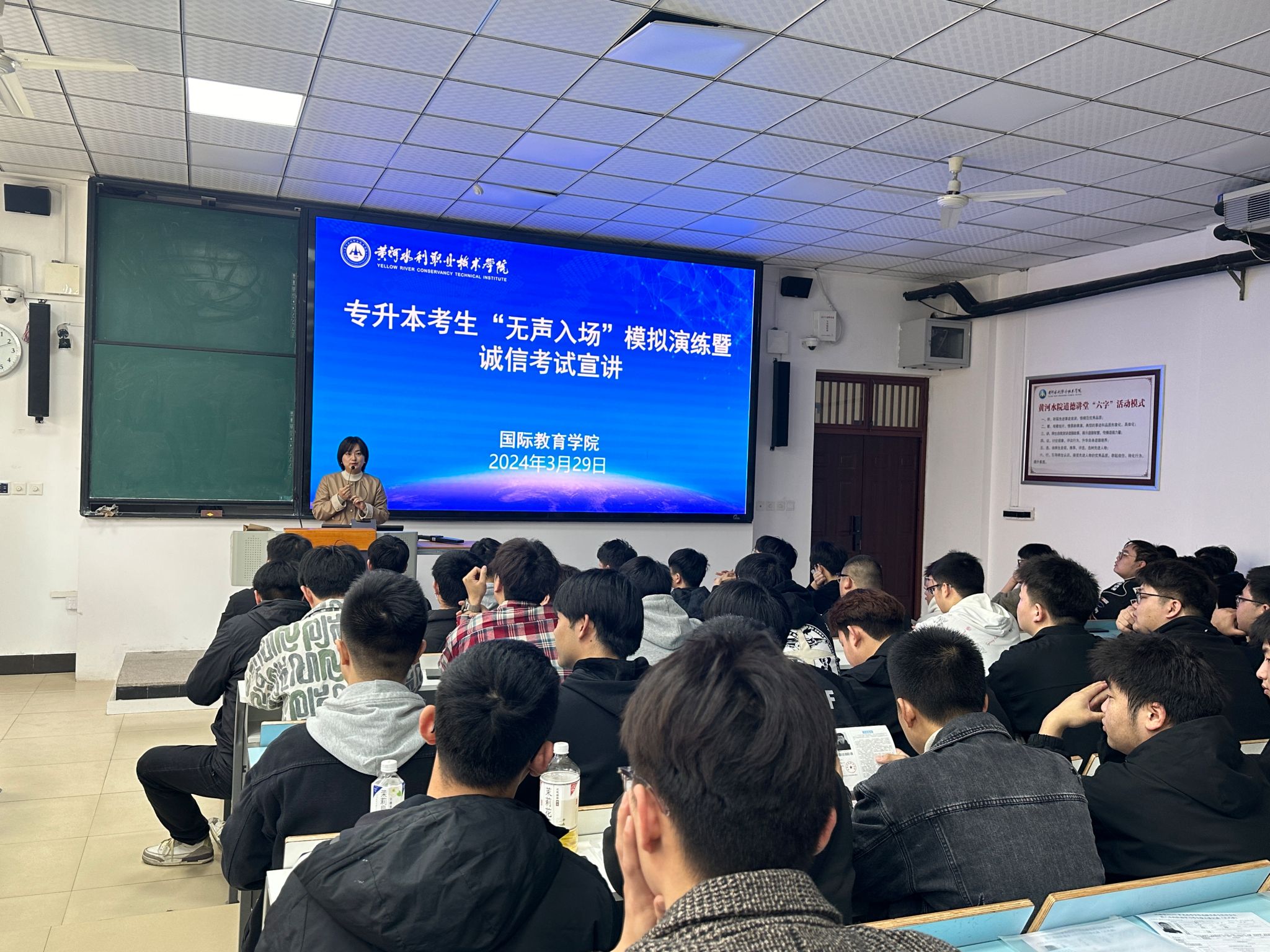 3月29日上午,我院在JX6103开展2024年专升本诚信考试教育暨“无声入场”模拟演练,校企合作办公室主任沈冰,毕业班辅导员黄海燕、丁晓婷,以及所有专升本学生参加了本次演练。
