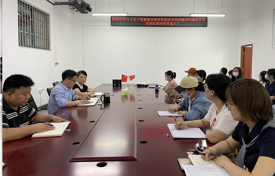 会上,首先由楚万强带领同志们共同学习《关于加强和改进新时代师德师风建设的实施意见》和《新时代高校教师职业行为十项准则》文件内容,领会文件精神。楚万强强调要求全体教师认真学习和领会文件精神,一定要提高政治站位,提升政治意识,所有工作要讲政治,要从政治角度发现问题,解决问题,始终保持高度的政治敏感度,言传身教,培养合格的社会主义接班人。
