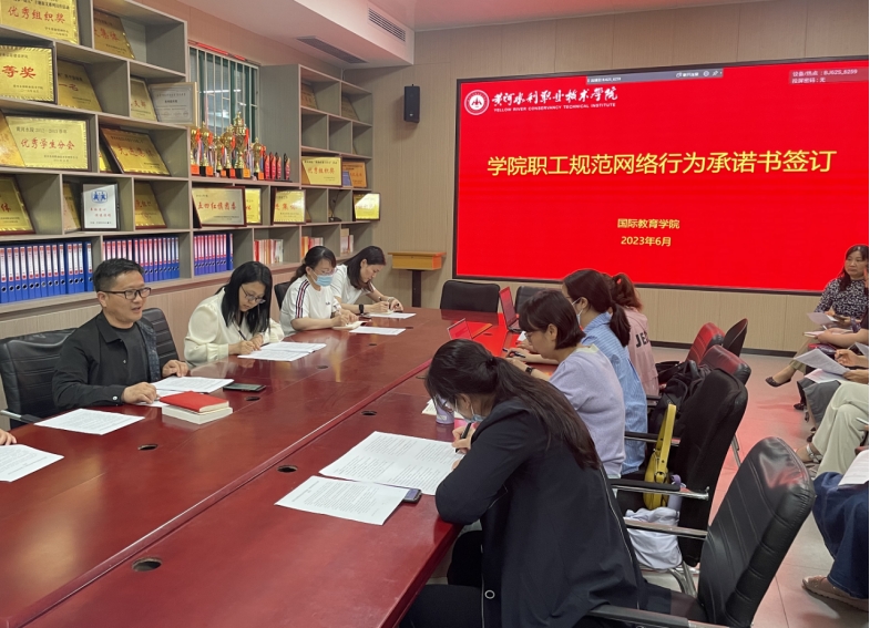 为积极引导广大师生发挥模范带头作用,切实规范网络行为,积极营造积极向上、风清气正的政治环境。66日下午,国际教育学院在7408会议室召开规范网络行为专题工作会议,组织教职工签订规范网络行为承诺书。