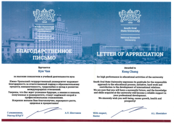 南乌拉尔国立大学颁发的优秀毕业生证书