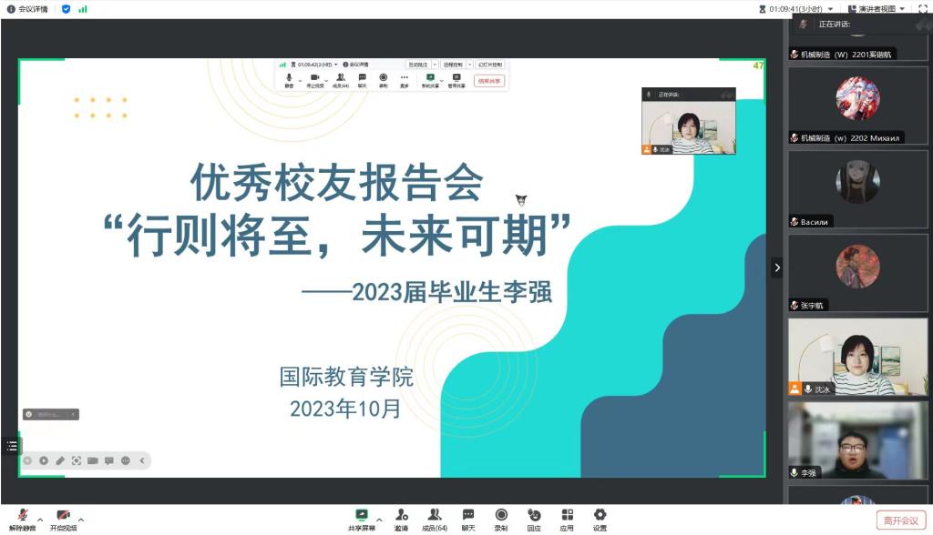 为展示我院毕业生的精神风貌,充分发挥榜样示范引领作用,2023年10月29日,国际教育学院在线举行优秀校友报告会,本次报告会邀请2023届优秀毕业生李强做升本和就业分享,2022级学生参加了会议,会议由校企合作办主任沈冰主持。