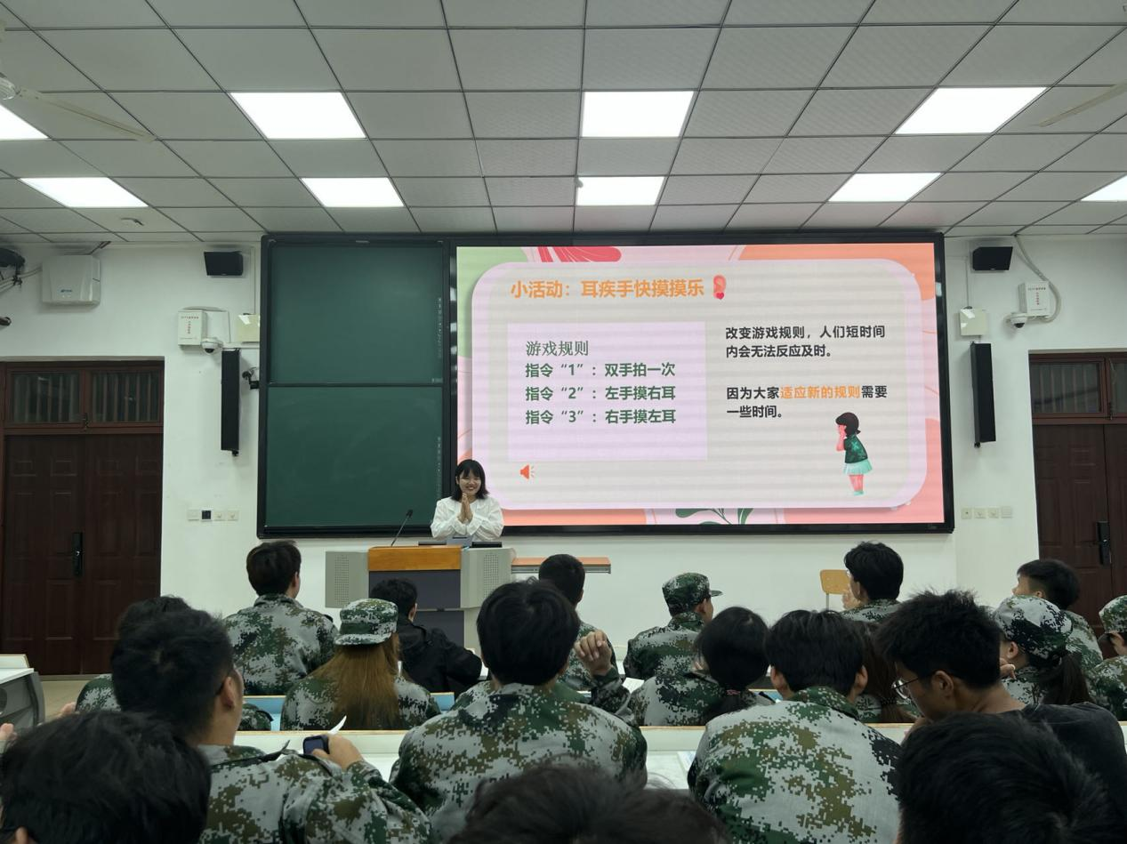 黄海燕首先与同学们进行了互动与交流,恭喜同学们转换角色,进入了大学生活,进入了梦想的新起点,并与同学进行了“耳疾手快摸摸乐”互动游戏,同学们积极参与互动,通过此次小游戏启迪大家,进入新的环境,都需要适应与调适。黄老师与同学们分享了心海导航的四条专属建议,与同学们分享了如何快速适应大学生生活,激励同学们开启行动,迈出适应第一步,开启快乐充实的大学生活。