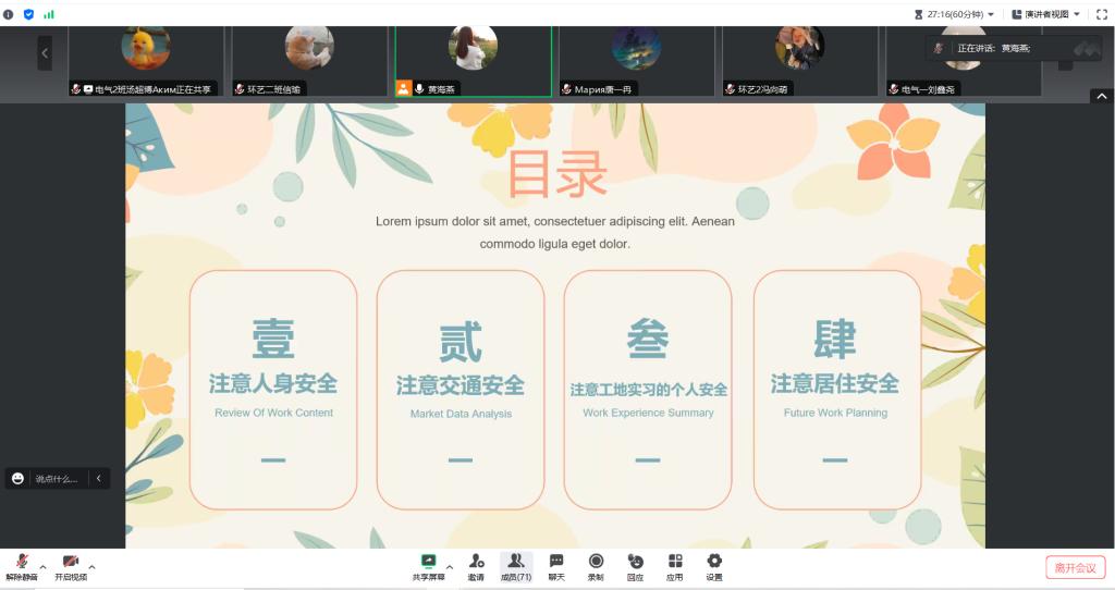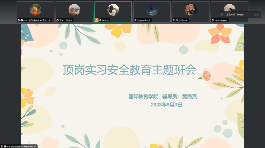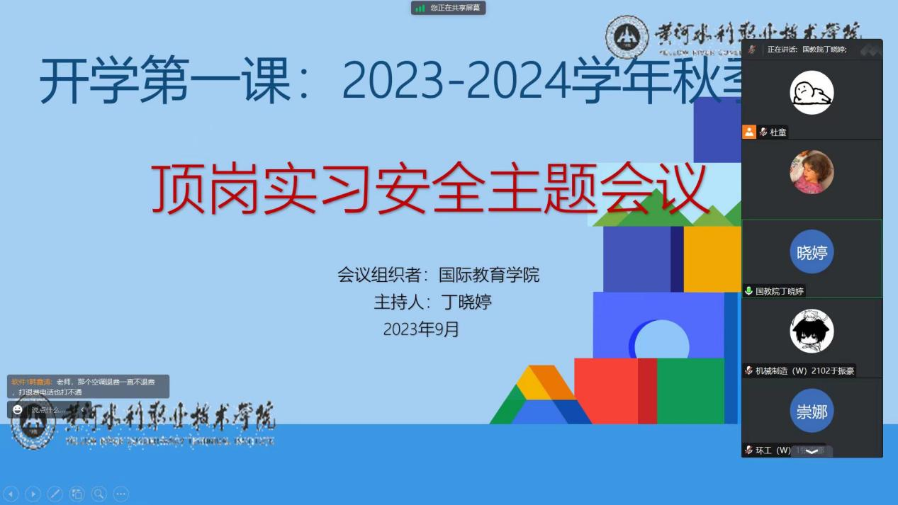 2023年9月3日,国际教育学院2021级辅导员黄海燕和丁晓婷为2021级学生在腾讯会议上召开2023-2024学年顶岗实习安全教育主题班会此次顶岗实习安全教育主题班会,黄老师与丁老师首先与同学们进行了交流,了解同学们在实习过程中有没有困难与需要帮助解决的问题,逐一进行解答。老师们提醒同学们在实习过程中将安全放在首位,一定提升安全意识,注意个人人身安全,注意在施工工地的安全防范措施以及交通安全。此次安全教育主题班会强化了同学们的安全防范意识提升了同学们自我保护能力,并为同学们完成实习后的就业选择提供了指引。