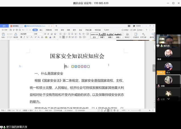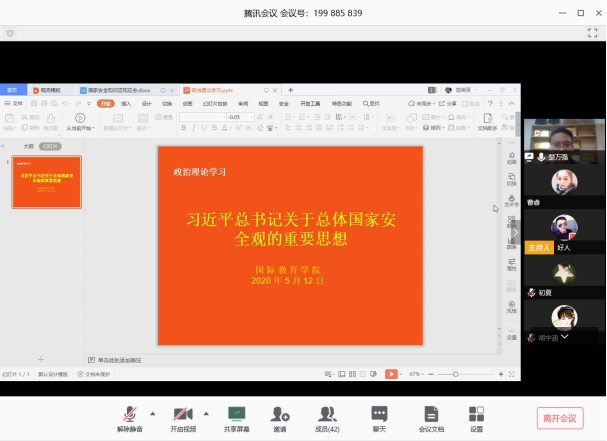 5月12日下午,国际教育学院通过腾讯会议直播平台召开了线上政治理论学习会,共同学习习近平总书记关于总体国家安全观的重要思想。学院全体教职工参加,会议由院党总支书记楚万强主持。