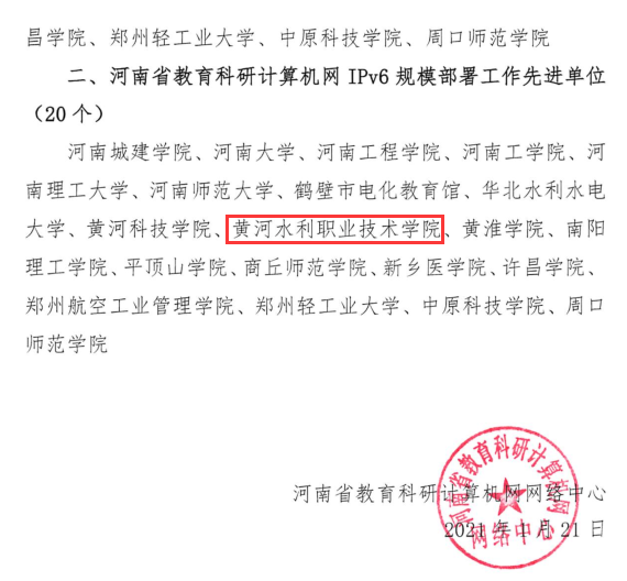 近日,在2021年河南省教育科研网工作会议上,我校被授予“IPV6规模部署工作先进单位”称号,全省137个联网单位中,共有20家单位获此荣誉。