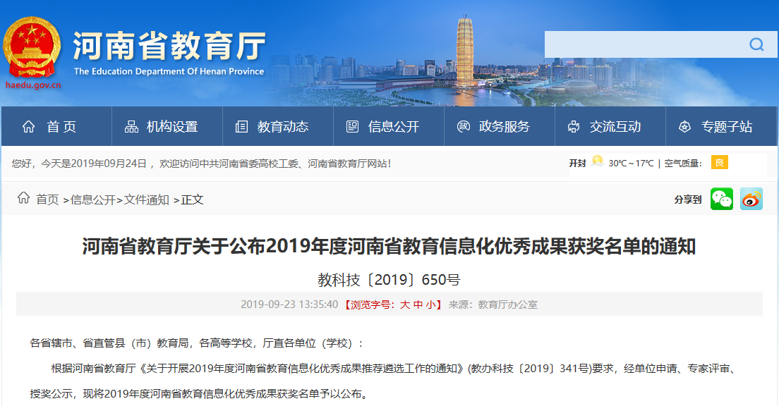 近日,省教育厅公布2019年度河南省教育信息化优秀成果奖获奖名单,我校3项成果获创新应用类一等奖。